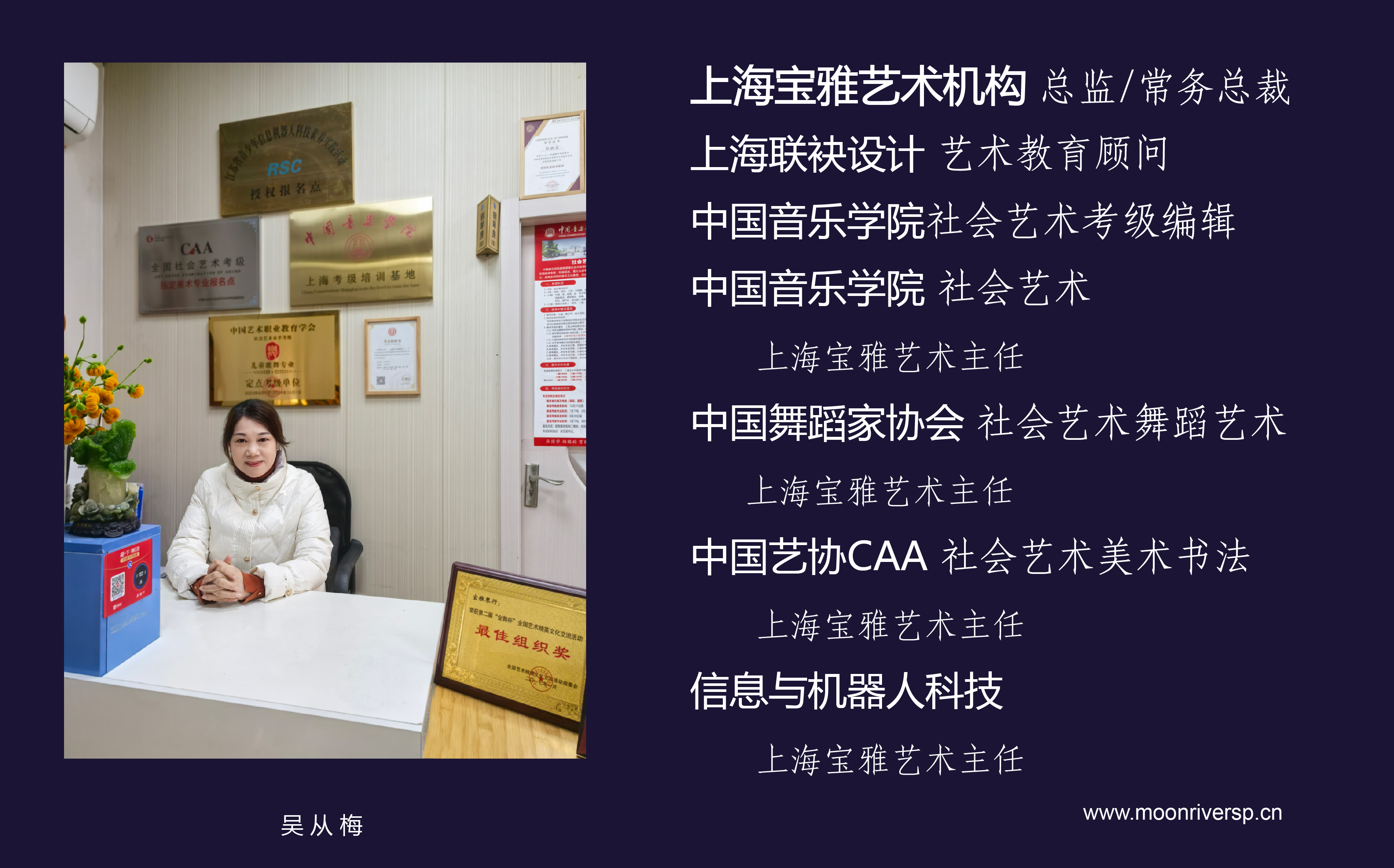 上海联袂设计 艺术教育顾问 上海宝雅艺术机构 总监/总经理 中国音乐学院社会艺术考级编辑 中国音乐学院社会艺术 上海宝雅艺术主任 中国舞蹈家协会 社会艺术舞蹈艺术 上海宝雅艺术主任 中国艺协CAA 社会艺术美术书法 上海宝雅艺术主任
